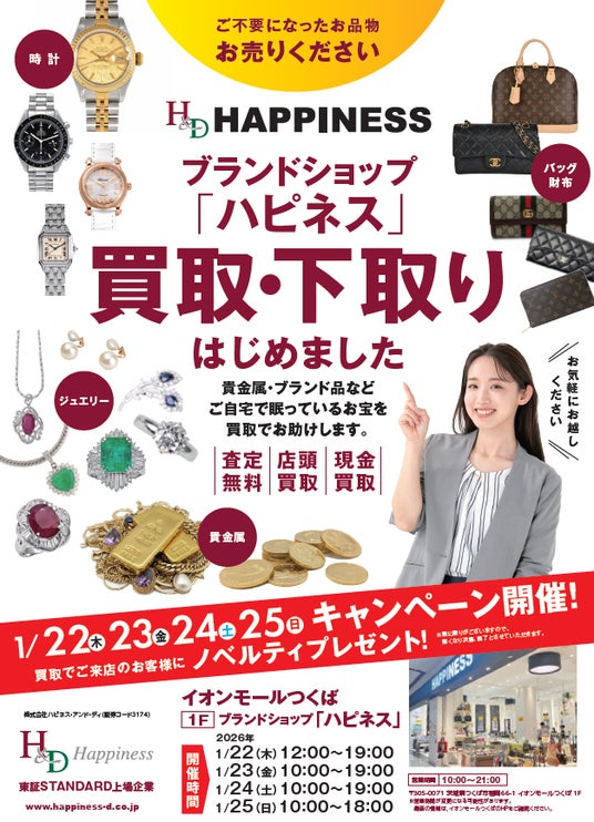 提携後の取り組みとして、2026年1月22日(金)より4日間、「ブランドショップハピネスつくば店」にて買取・下取りのトライアル催事を開催いたします。