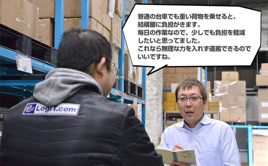 前進・後進の操作は手元で簡単に行え、少ない力で重量物の運搬が可能。