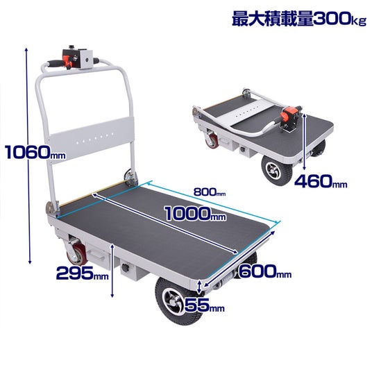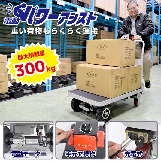 本製品は、電動モーターによるアシスト機能を備えた、最大積載量300kgの電動アシスト台車です。