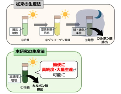 過去に報告された生産法では、1.明所で培養、2.細胞を窒素を制限した培地に移してグリコーゲンを蓄積、3.暗所・無酸素条件(発酵条件)という3工程を経てカルボン酸を生産します(上図)。一方、本研究での生産法は、1.明所で培養のみの1工程で、カルボン酸を高純度で大量生産が可能です(下図)。