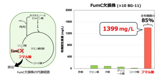 本研究グループは、まずシネコシスティスの野生株とFumC欠損株を明好気条件下で培養しました。その結果、FumC欠損株は野生株と比較して光合成活性が向上しており、さらにFumC欠損株においてのみフマル酸が細胞外へ排出されることを確認しました(図2)。