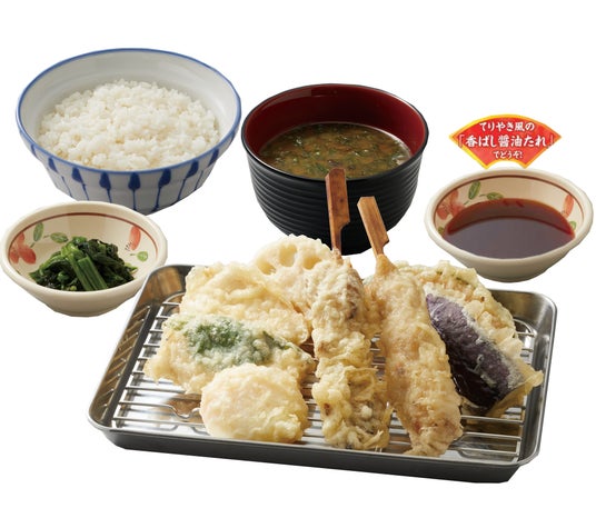 とりたま月見天ぷら定食 1040円(税込み)揚げたてサクサクの天ぷらに、てりやき風味の「香ばし醤油たれ」を付けて食べる一品。