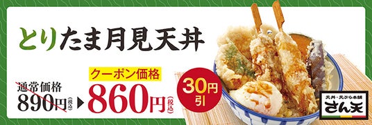 「天丼・天ぷら本舗 さん天」公式アプリでは、販売期間中に使える「とりたま月見フェア 30円引きクーポン」を配信いたします。会員の方限定でご利用いただけるクーポンですので、この機会にぜひ「天丼・天ぷら本舗 さん天」公式アプリをダウンロード&会員登録ください。