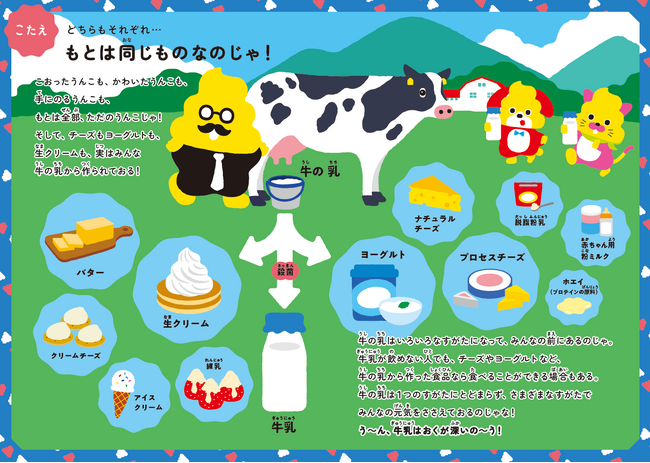 クイズに答えたあと設問ごとに設けられた、うんこ先生による教えもポイント。クイズの答えだけでなく、なぜそうなのかという理由もていねいに説明されています。ここを読むことで、牛乳の知識をさらに深く学べるようになっています。