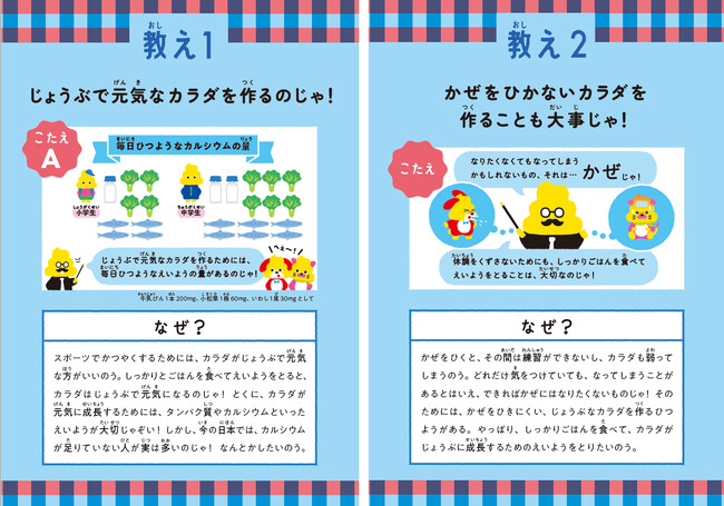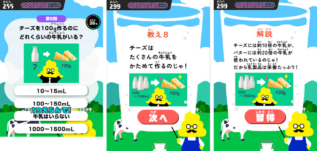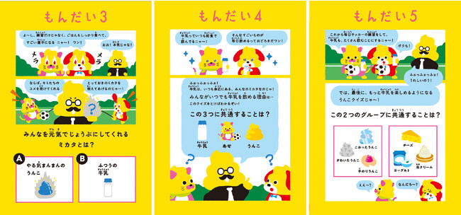 クイズをつうじて、丈夫で元気なカラダを作るためにはカルシウムやたんぱく質などの栄養が必要であること、牛乳にはそれらの栄養が多く含まれていること、毎日おいしい牛乳が飲めるのは牧場の人たちが牛の健康やすごしやすい環境に配慮し、お母さん牛が毎日お乳を出すからであること、牛の乳は牛乳以外にも、チーズやバター、生クリームやヨーグルトといった様々な食品となってカラダづくりを支えていることといった、牛乳に関するさまざまな知識を学ぶことができます。
