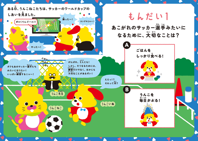 冊子では、サッカー観戦をしているうんこねことうんこいぬに、うんこドリルシリーズでおなじみのキャラクター・うんこ先生から、あこがれのサッカー選手になるためには丈夫で元気なカラダを作るのが大切なことを教える場面からはじまります。