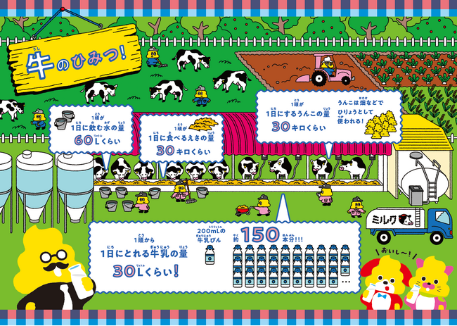 5問のクイズにすべて答え終わると、うんこ先生たちが牧場でおいしく牛乳を飲んでいるイラストが登場。ここでは「牛のひみつ」として、牛一頭が一日に食べる餌の量や、一日にするうんこの量(そのうんこは畑などで肥料として使われること)、一日に採れる牛乳の量などにも目を向けてもらえるようになっています(ちなみに牛一頭から一日に採れる牛乳の量はおよそ30リットル(200mlの牛乳びん150本分)です)。