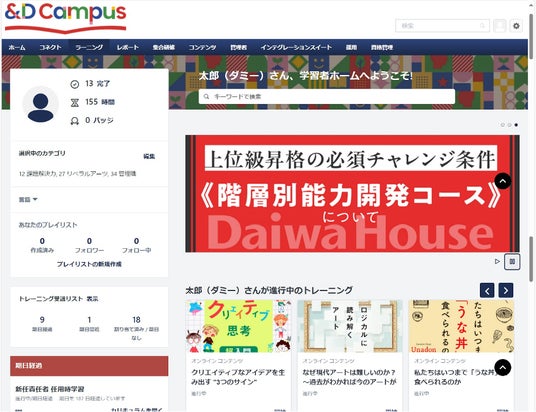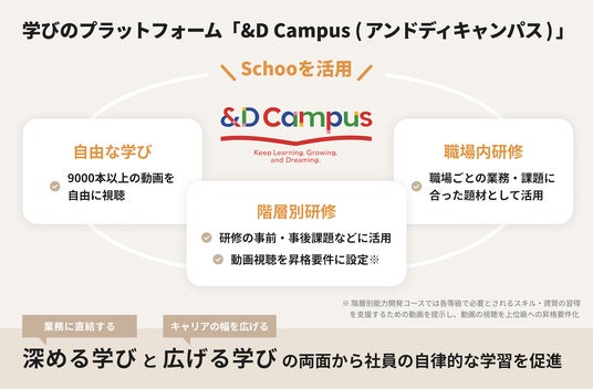 インターネットでの学びや教育を起点とした社会変革を行う株式会社Schoo(本社:東京都渋谷区、代表取締役社長:森 健志郎、以下「スクー」)は、大和ハウス工業株式会社(本社:大阪市、代表取締役社長:大友浩嗣、以下「大和ハウス工業」)の推進する人財育成施策において、全社員約1万6,000人を対象とした自律的学習支援プラットフォーム「&D Campus(アンドディーキャンパス)」における学習コンテンツとして導入いただきました。本プラットフォームでは、当社と提携している米国大手コーナーストーン オンデマンドの提供する学習管理システムとの連携によって提供しています。