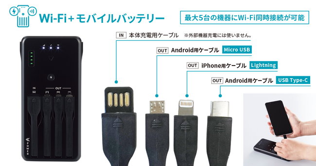 本体充電用のUSBケーブルに加え、スマホなどの充電に対応した3タイプのケーブルを内蔵し、モバイルバッテリーとしてもご利用できます。荷物になる専用ポーチや充電器などは付属しません。