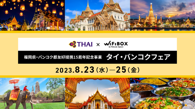 モバイル通信のクロスボーダー・ソリューションを世界規模で提供する株式会社テレコムスクエア(本社:東京都千代田区 代表取締役:吉竹 雄次 以下、当社)のWi-Fiレンタルサービス「WiFiBOX」は、タイ国際航空(以下、タイ航空)と共同で、2023年8月23日(水)~25 日(金)にJR博多駅前 賑わい交流空間 大屋根イベントスペースにて開催される「福岡県・バンコク都友好提携15周年記念事業 タイ・バンコクフェア」に出展いたします。