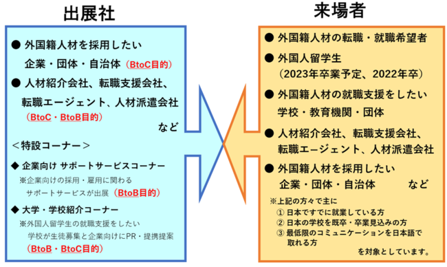 このような状況の中、インターナショナルジョブフェア実行委員会は、外国人材の採用を希望する企業と、日本で転職・就職を希望する外国人材のマッチングの場(BtoC)および、外国人材の採用・雇用サービスをお持ちの企業と、外国人雇用企業のマッチングの場(BtoB)を創出することを目的とし、一般社団法人 外国人雇用協議会との共催にて、「第2回インターナショナルジョブフェア東京 2022」を規模を大幅に拡大して開催いたします。