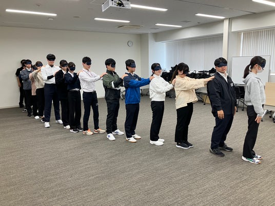 研修では、参加者が視覚を閉じた状態でゲーム形式の体験を行いました。