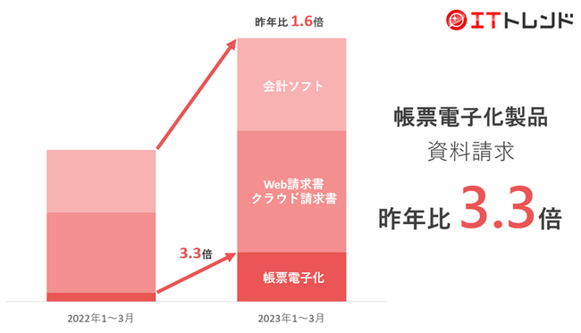 電子帳簿保存法、インボイス制度対応のためのIT製品に注目が集まり、今回最も上昇した製品カテゴリとなった「帳票電子化」の請求数は昨年の同じ期間に対して3.3倍増加しました。