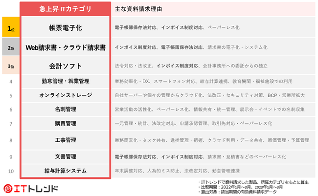 今回最も上昇した製品カテゴリーは「帳票電子化」に次いで、2位の「Web請求書・クラウド請求書」とともに販売関連の製品への需要が高まっています。資料請求ユーザへのヒアリングからその背景には電子帳簿保存法、インボイス制度などの対応が必要であることもわかりました。