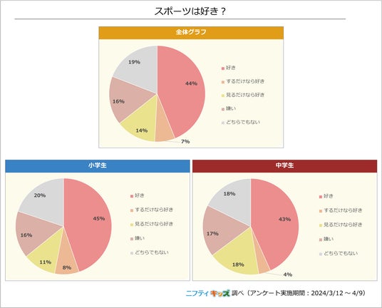 「好き」と回答した小学生は45%、中学生は43%と年代による差は大きくありませんでした。「するだけなら好き」と「見るだけなら好き」を合わせると、どちらの年代でも6割以上の人がスポーツを好きだと感じているようです。