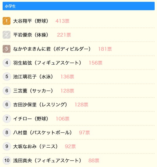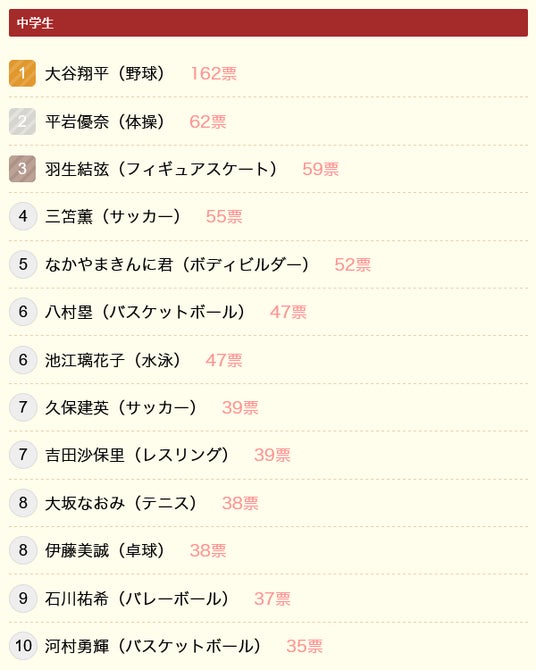 どの年代でも圧倒的に支持されているのが、野球の大谷翔平選手です。2位の体操・平岩優奈選手と大きく差をつけて1位に輝きました。