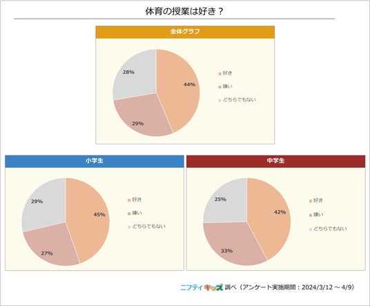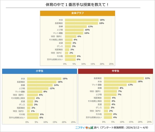 一方で、体育の授業については44%が「好き」、29%が「嫌い」と回答しました。体育の中での苦手な種目は小学生では「水泳」、中学生では「長距離走」が1位でした。