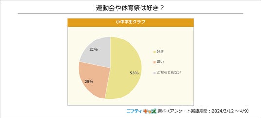 また、運動会や体育祭を「好き」と答えた人は小中学生の53%でした。「嫌い」と回答した人は25%で、嫌いな理由として「運動が苦手」をあげる人が多く、ほかにも「一致団結の雰囲気が嫌だ」と感じている人もいました。