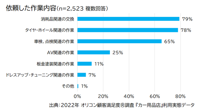 以降は、「車検、点検関連の作業」(65%)「AV関連の作業」(25%)と続き、車検や法定12ヶ月点検、ドライブレコーダー、カーナビの取付などのニーズがうかがえます。