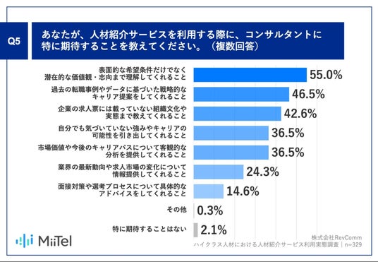 「Q5.あなたが、人材紹介サービスを利用する際に、コンサルタントに特に期待することを教えてください。(複数回答)」(n=329)と質問したところ、「表面的な希望条件だけでなく潜在的な価値観・志向まで理解してくれること」が55.0%、「過去の転職事例やデータに基づいた戦略的なキャリア提案をしてくれること」が46.5%、「企業の求人票には載っていない組織文化や実態まで教えてくれること」が42.6%という回答となりました。