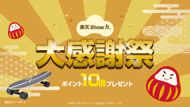 楽天市場「Show !t」は、12月19日(月)20時~12月26日(月)01時59分まで開催される楽天大感謝祭に参加し、ポイント10倍プレゼント(一部商品を除く)・全商品送料無料を実施します。また、MESTER.F電動スケートボードご購入で、12,000円相当の収納バックとヘルメットもしくは、キッズプロテクターのセットをプレゼントするキャンペーンを開催。さらに、楽天大感謝祭特典としてMEISTER.Fオリジナル防水バッグプレゼント。