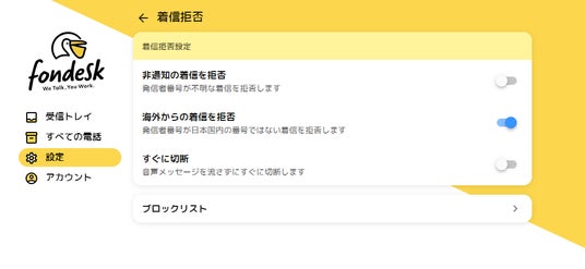 こうした背景を受け、fondeskでは新たに「海外からの着信ブロック機能」を追加いたしました。本機能により、海外からの着信を一括でブロックすることが可能となります。