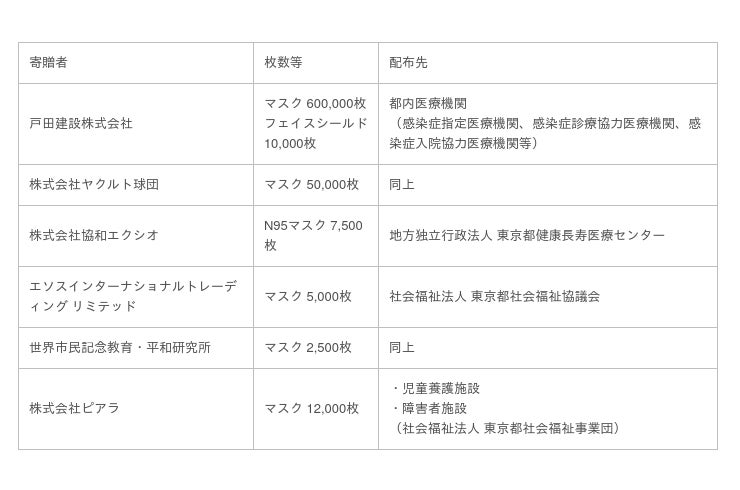 2020-05-08 東京都 マスク等の寄贈及び配布について Tweet ~新型コロナウイルスに関する東京都からのお知らせ~ この度、東京都にマスク等の寄贈が6件あり、下記のとおり配布しましたので、お知らせします。 記 [表: https://prtimes.jp/data/corp/52467/table/318_1.jpg ] 企業プレスリリース詳細へ PR TIMESトップへ 公式ツイッター Follow @Straightpress 最新情報をTwitterで受け取ろう! 公式フェイスブックページ 最新情報をFacebookで受け取ろう! 前の記事 一覧へ戻る 次の記事