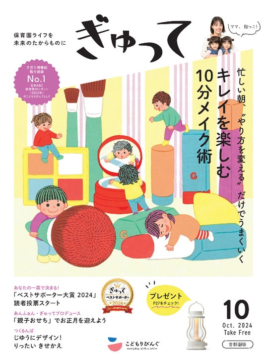 「ぎゅって」は共働き家族の気持ちに寄り添うフリーマガジンです全国私立保育園連盟をはじめ、連盟・協議会・団体・行政の承認・協力を得て、毎月1回(地域により異なる)、首都圏・関西圏・東海圏の保育園で計約36万配布しています。独自の編集方針で保育園や園児とその保護者から信頼を得ることをモットーに、仕事と子育ての両立、時短など働くママ・パパの気持ちに寄り添う特集、連載を展開しています。