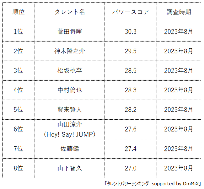 『タレントパワーランキング』では、2023年8月調査のパワースコアにおいて、30代男優に焦点を当てて、ランキング形式にまとめました。