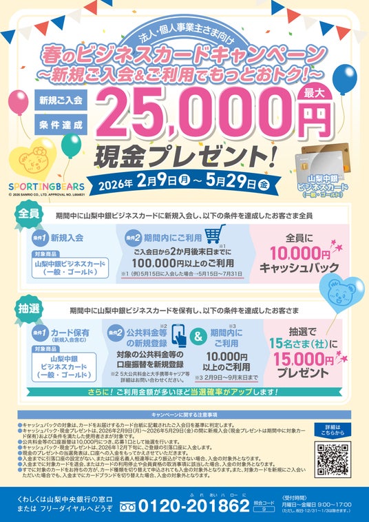 株式会社山梨中央銀行(頭取 古屋 賀章)と、山梨中銀ディーシーカード株式会社(代表取締役社長 萱沼 雄三)は、2月9日(月)から法人・個人事業主のお客さまを対象に「春のビジネスカードキャンペーン~新規ご入会&ご利用でもっとおトク!~」を実施します。