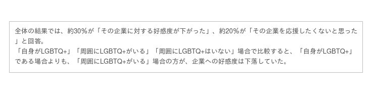「自身がLGBTQ+」の場合を見るとその割合はさらに高く、39.0%が企業に対し好感を抱き、32.1%が応援したいという気持ちを抱くことがわかりました。