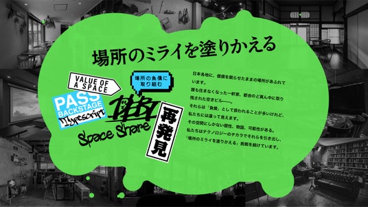 日本各地に、価値を眠らせたままの場所があふれています。誰も住まなくなった一軒家、都会のど真ん中に取り残された空室ビル--。それらは「負債」として扱われることが多いけれど、私たちには違って見えます。その空間にしかない個性、物語、可能性がある。私たちはテクノロジーのチカラでそれらを引き出し、「場所のミライを塗りかえる」挑戦を続けています。