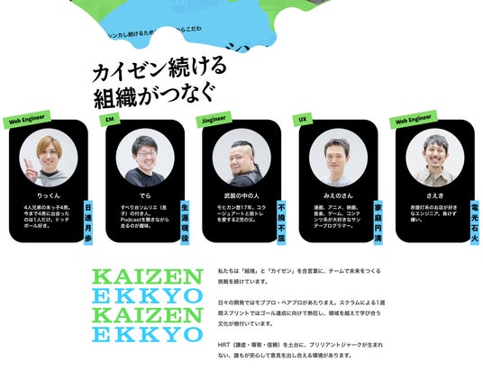 私たちは「越境」と「カイゼン」を合言葉に、チームで未来をつくる挑戦を続けています。日々の開発ではモブプロ・ペアプロがあたりまえ。スクラムによる1週間スプリントではゴール達成に向けて熱狂し、領域を越えて学び合う文化が根付いています。HRT(謙虚・尊敬・信頼)を土台に、ブリリアントジャークが生まれない、誰もが安心して意見を出し合える環境があります。