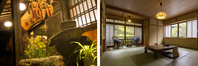 1722年創業の御客屋は歴史ある黒川温泉地区に位置し、黒川温泉からわずか100mと温泉好きにぴったりの宿泊施設です。畳敷きの客室や貸し切りも可能な7つの湯処が揃い、日本の古き良き伝統を追求した温もりのある空間が広がっています。また、「半農半宿」スタイルのこの施設では、自家農園で栽培された野菜や地元の食材をふんだんに使った料理を堪能することができます。