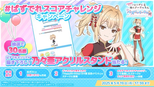 宮前 乃々亜の誕生日を記念して、公式Xでは本日5月13日(火)より「#ぱずでれハイスコア キャンペーン」を開催します。ゲーム内で開催中の「HappyBirthday! 宮前 乃々亜イベント」のステージにて、乃々亜をデッキに編成して、ステージをプレイするキャンペーンです。