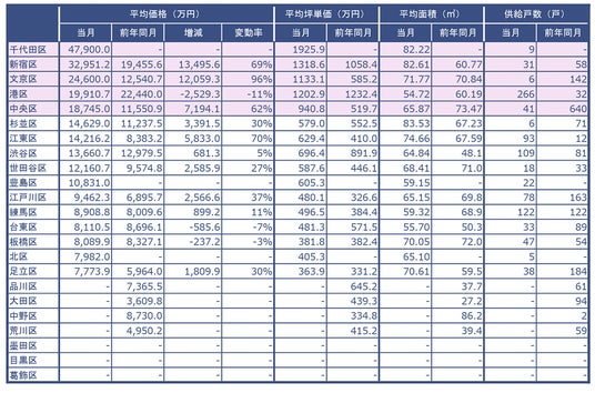 東京23区の各行政区毎に、平均価格、平均坪単価、平均面積、供給戸数をまとめました。当月の平均価格が大きい順に表示しています。