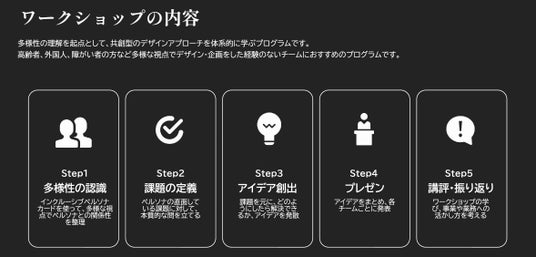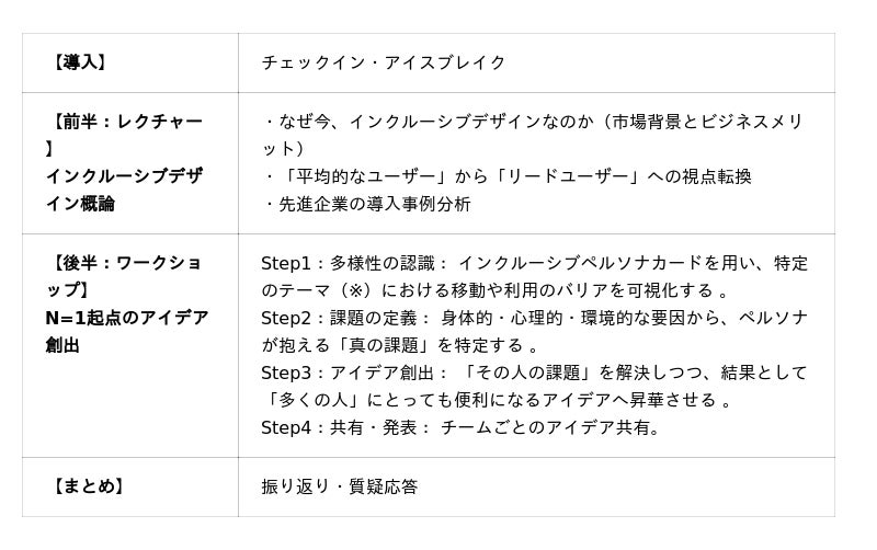 ワークショップのタイムテーブル(多様性の認識→課題の定義→アイデア創出→プレゼン→講評・振り返り)
