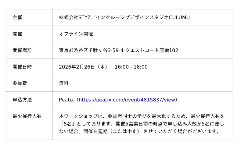 インクルーシブデザインを強みとするCULUMU(運営:株式会社STYZ、本社:東京都渋谷区、代表取締役:田中辰也、以下「CULUMU」)は、2026年2月26日(木)、既存事業の延長線上にない、新たな事業創出を模索するR&D・企画担当者に向けた無料ワークショップを実施します。 既存市場の調査データは「過去」の集積に過ぎず、まだ世の中にない価値を生み出すヒントはそこにはありません。本講座では、市場の端(エッジ)にいるユーザーの深い洞察(インサイト)から、万人に通じる普遍的な価値を逆算して導き出す独自メソッドを伝授。ありきたりな企画から脱却し、確かな根拠を持って未来のスタンダードを実装するための「探索力」を養います。