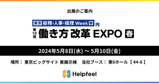 株式会社Helpfeel(京都府京都市、代表取締役/CEO:洛西 一周、以下「当社」)は、2024年5月8日(水)~5月10日(金)に東京ビッグサイトで開催される展示会「第13回 働き方改革 EXPO 春」に出展し、PDFのユーザーマニュアルを検索できる「Helpfeel User Manual Search」をご紹介いたします。