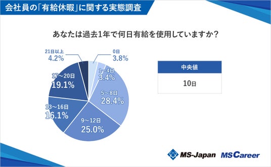 本調査ではまず、過去1年での有給の消化日数について調査を実施。消化日数の中央値は「10日」で、「5~8日」消化した人の割合が最多となり、「6割」が10日以上消化できていることが明らかになりました。また、有給消化率は平均「62.3%」でした。