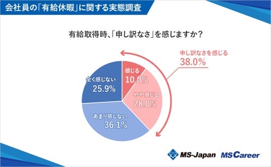 続いて、有給取得時の「罪悪感」について調査を実施。「4割」が「申し訳なさ」を感じるという結果に。また、年代別では、若い世代ほど申し訳なさを感じていることも明らかになりました。