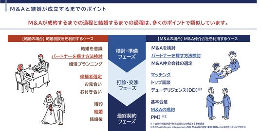 M&Aの検討から成約までどのようなフェーズを経て進んでいくか、譲渡企業(売り手)と譲受企業(買い手)を縁組みするM&A仲介を結婚相談所に例えて分かりやすく解説しています。