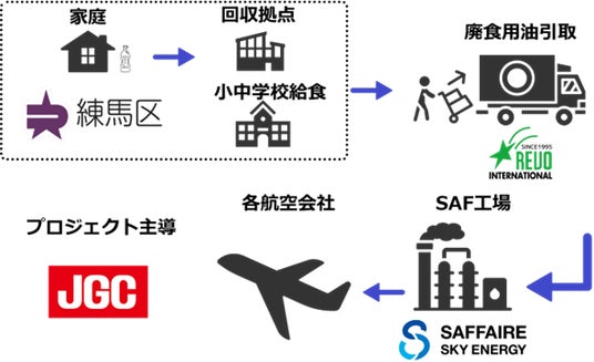 今回の協定に基づき、練馬区が回収した廃食用油をレボインターナショナルが収集し、国内初のSAF大規模生産を行うSAFFAIRE SKY ENERGYのプラント(コスモ石油堺製油所内)へ運び、国産SAFの原料として資源化します。