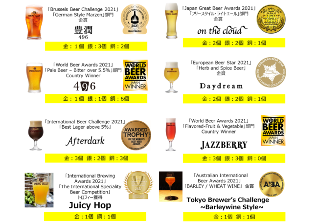 ※Australian International Beer Awards、International Beer Cup、European Beer Star、International Brewing Awards、World Beer Cup(World Beer Cupは隔年開催のため2021年は休会)