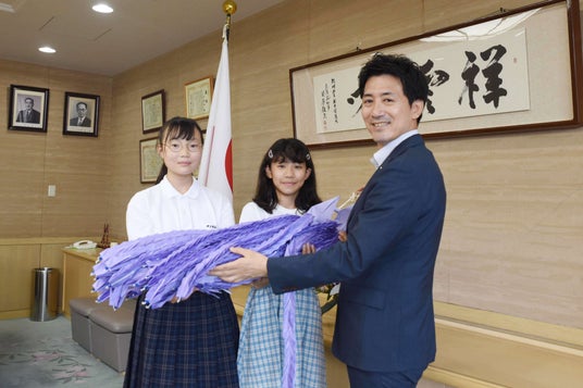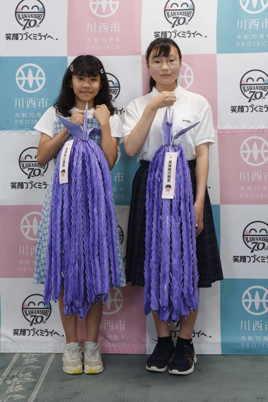 30日、今年の「折り鶴平和大使」となった川西市立桜が丘小学校6年生の斉藤和奏さん(さいとう わかな、11歳)と川西市立明峰中学校2年生の藤田春風さん(ふじた はるか、14歳)が、兵庫県川西市役所を表敬訪問。それぞれに対し、越田謙治郎川西市長から市民の平和への想いが込められた折り鶴約1万羽のうち、500羽ずつが手渡されました。2人は8月5日に広島へ向け出発します。