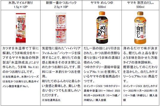 ・ヤマキ商品セット(氷熟(R)マイルド削り1.5g×12P、新鮮一番かつおパック2.5g×10P、めんつゆ500ml、割烹白だし500ml 各1個ずつ)