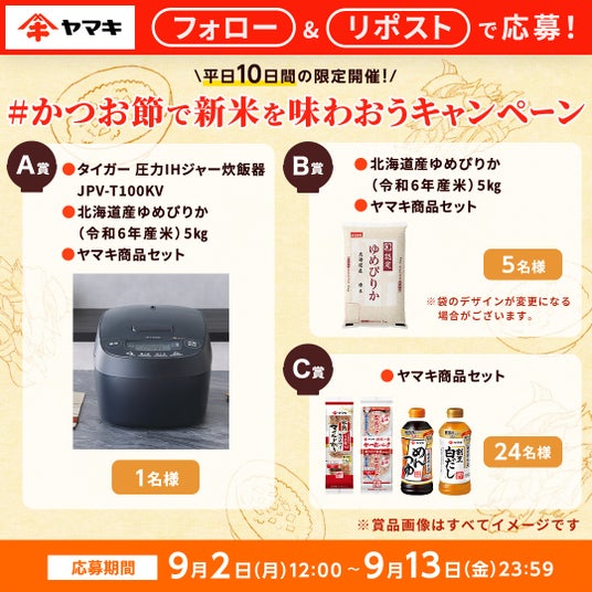 ヤマキ株式会社(本社:愛媛県伊予市 代表取締役社長:城戸善浩 以下 ヤマキ)は、2024年9月2日(月)12:00よりX(旧Twitter)アカウントにて「#かつお節で新米を味わおうキャンペーン」を実施します。