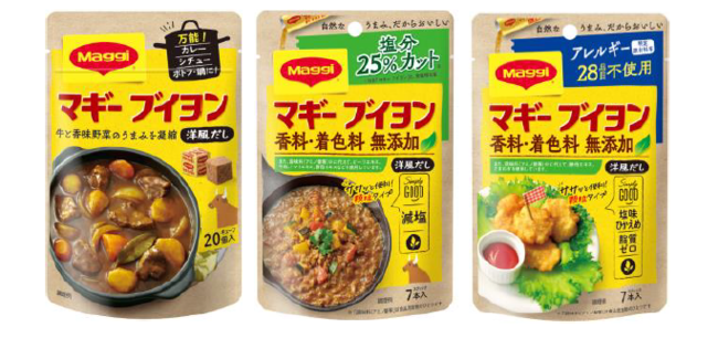 画像(左より): 「マギー ブイヨン 袋 20個入り」、「マギー ブイヨン 無添加 塩分25%カット 7本入り」、