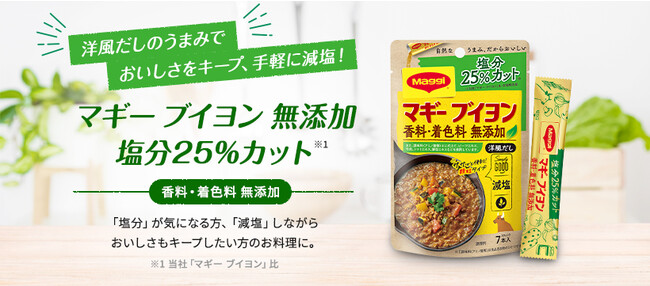 本製品は、香料・着色料無添加のブイヨンで、塩分は「マギー ブイヨン」と比較して25%低くなっています。