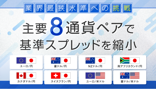 SBI FXトレード株式会社(本社:東京都港区、代表取締役社長:藤田 行生)は本日より、主要8通貨ペアの基準スプレッドを縮小したことをお知らせいたします。4月12日から5月11日まで実施していた同通貨ペアのスプレッド縮小キャンペーンのご好評を受け、その縮小後スプレッドを恒常化させるものとなります。